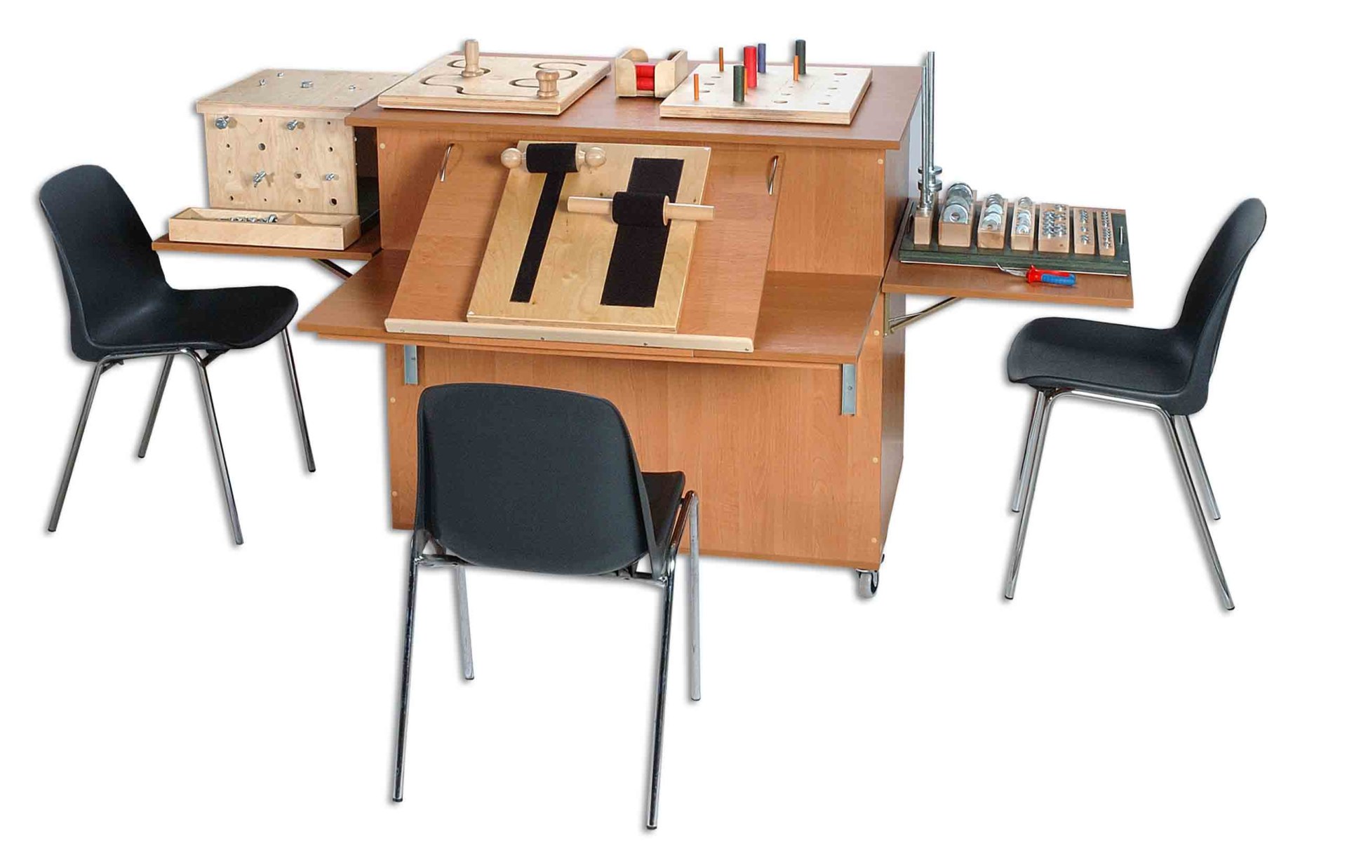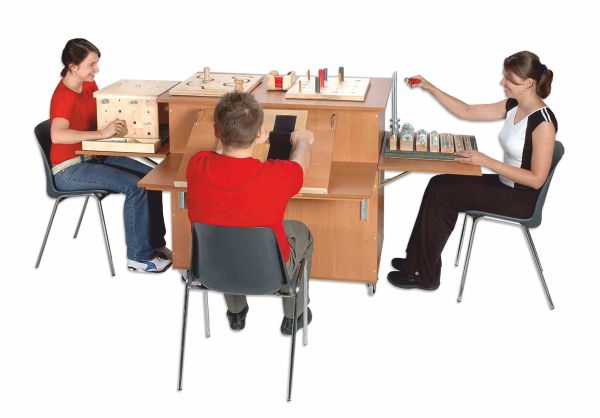 Это устройство предназначено для людей с различными заболеваниями рук. Применяется при параличе и деформации кисти, возникшей в результате заболеваний: ревматических, неврологических, ортопедических травм и др. Набор для выполнения активных упражнений для кисти, улучшает зрительно-моторную координацию и точность захвата. В комплект MANUS входит основной блок на тележке с 3 мягкими поверхностями и 4 терапевтическими столами. При желании вы можете произвольно настроить содержимое выбранной таблицы: TM1-TM14.
