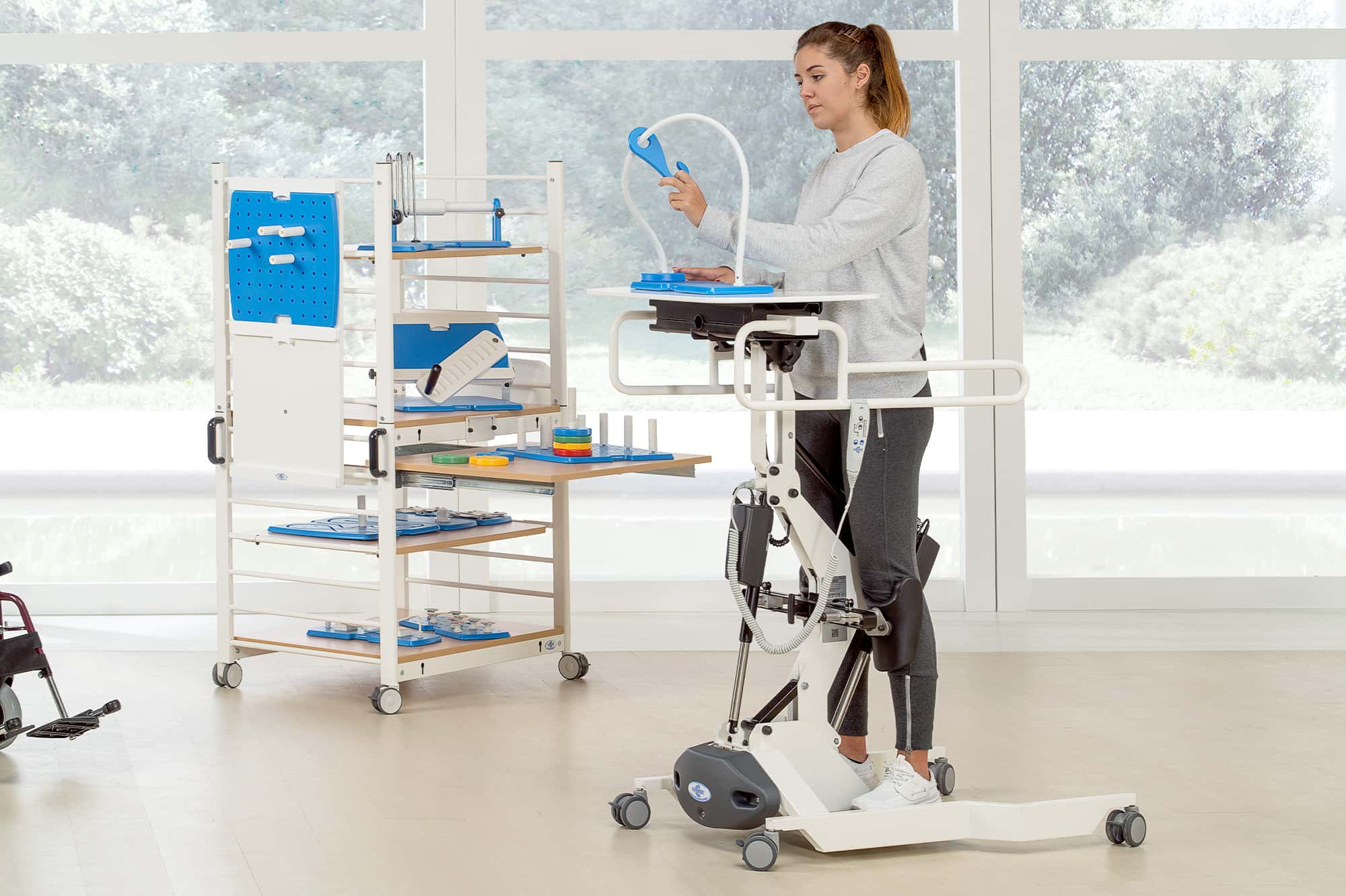 Эта станция предназначена для использования в качестве места для хранения различных вспомогательных средств и в качестве мобильного рабочего места. Металлическая конструкция с тремя деревянными полками, боковыми ручками и поворотными роликами с индивидуальными тормозами. Центральная полка имеет регулировку по высоте. На конструкцию также могут быть установлены некоторые аксессуары, которые расширяют ее использование, позволяя одновременно работать в четырех положениях, сидя или стоя.