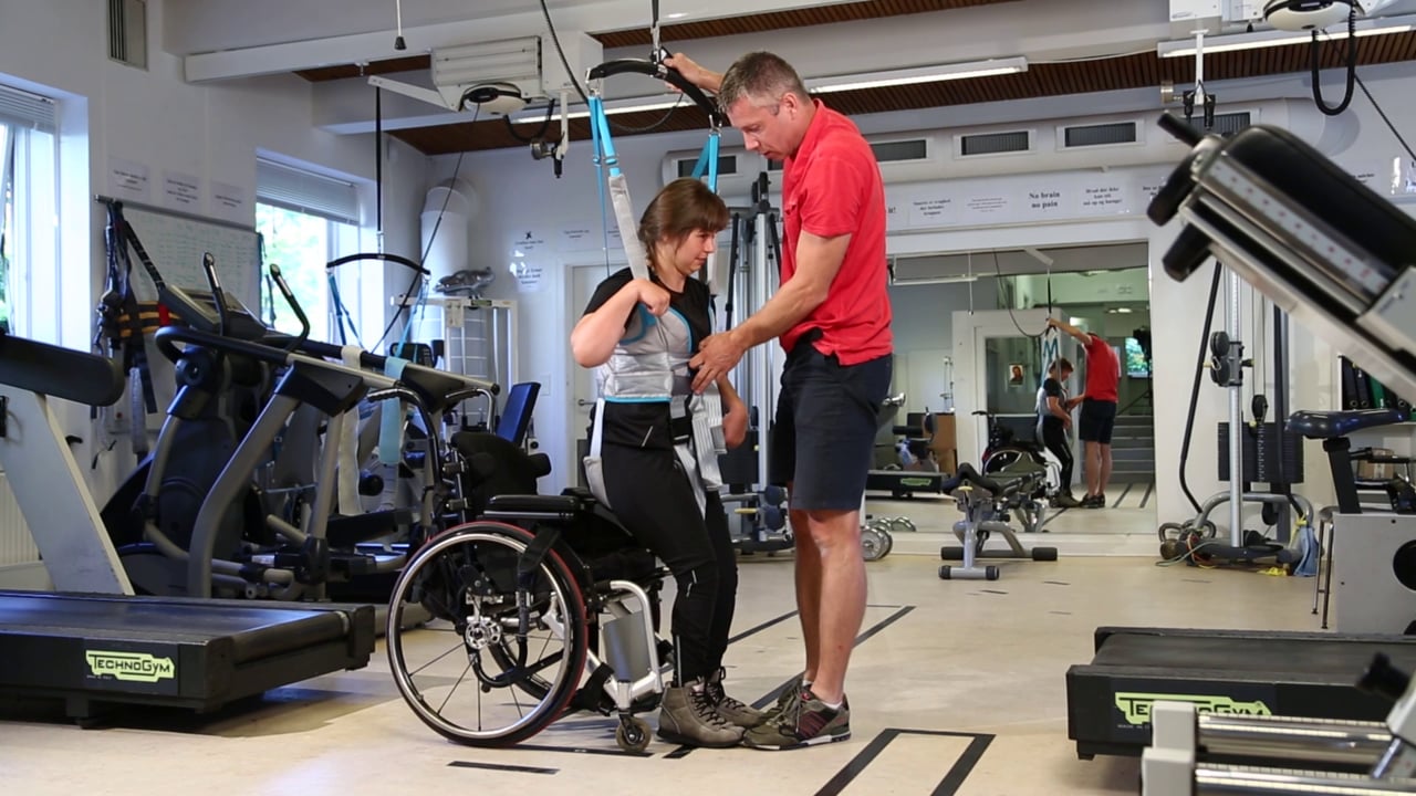 Подъемная система REHA может использоваться для обучения пациента ходьбе. Эта уникальная система может быть помощником в зале ЛФК при проведении занятий. Для этого используются специальные активные стропы, которые поддерживают грудную клетку пациента и не фиксируют нижние конечности.